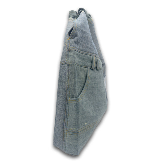 The Oversized Sack Tote reimagines classic denim through a modern, sculptural silhouette. Crafted entirely from reclaimed jeans, this one-of-a-kind piece highlights the natural textures and fading of lived-in denim, giving each bag its own story and character.
