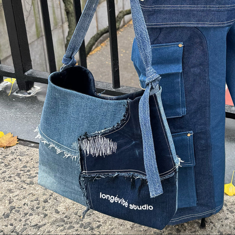 Crafted from a curated mix of reclaimed denim washes, this slouchy bag gives yesterday’s textiles a bold new life. Its soft-structured silhouette is pieced together with intentional paneling, visible top stitching, and raw-edge distressing that celebrates the beauty of imperfection and the story behind every scrap.