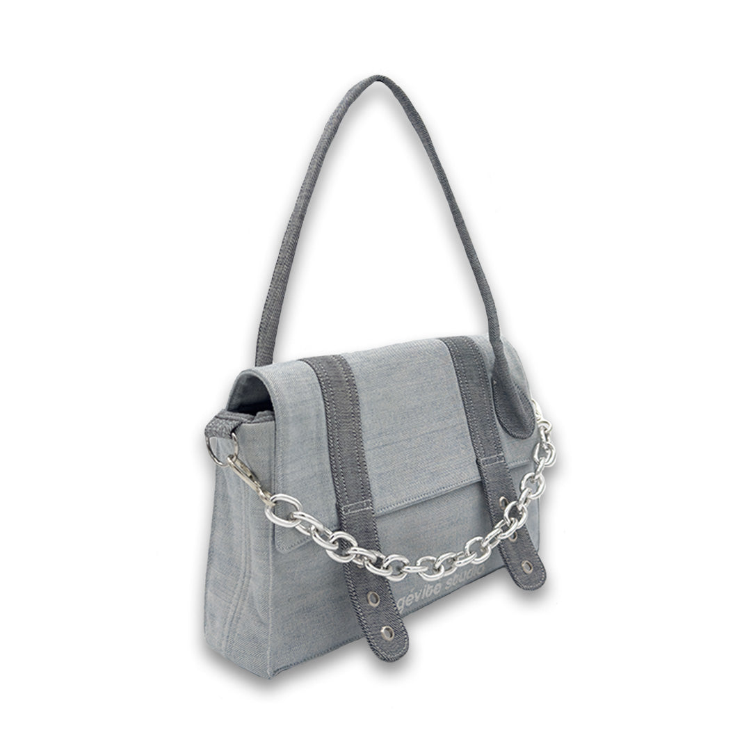 Where utility meets edge, The Mini Shoulder Bag redefines the everyday bag with sustainable intention and street-ready design. Crafted from reclaimed denim, this compact silhouette is both structured and effortless, designed to move with you from day to night. The standout chain detail adds a bold, industrial finish while the structured handle gives it a sleek and modern feel.
