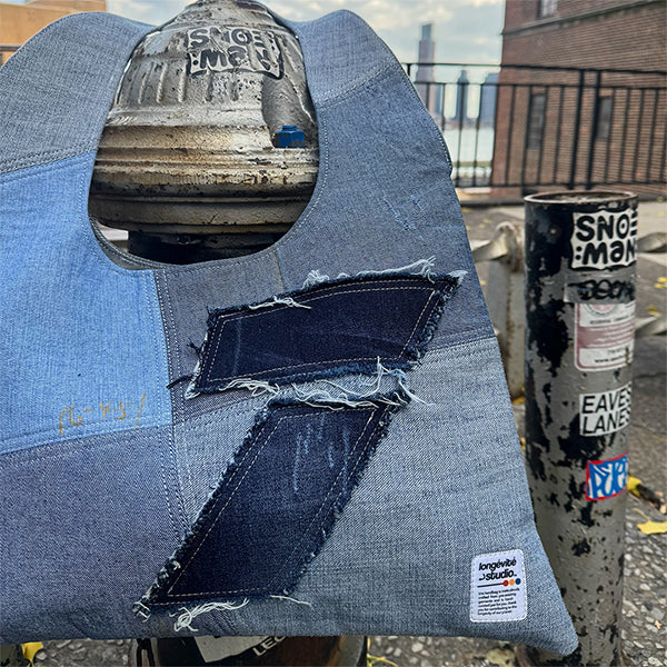Effortlessly cool and consciously crafted, the Day Tote is a signature Longévité Studio piece. Hand-curated from an assortment of reclaimed denim, each panel is thoughtfully placed to highlight contrasting washes, natural fading, and raw frayed edges that honor the history of the textile. The asymmetrical patchwork construction creates sculptural interest, while visible mending-inspired stitching adds a touch of artisanal character.