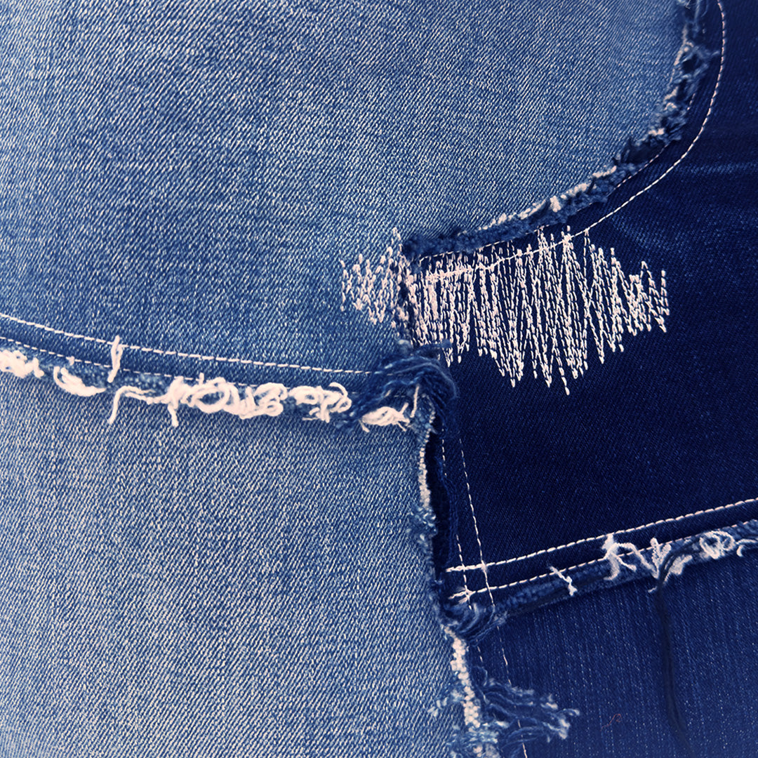 - Asymmetrical patchwork with raw distressing