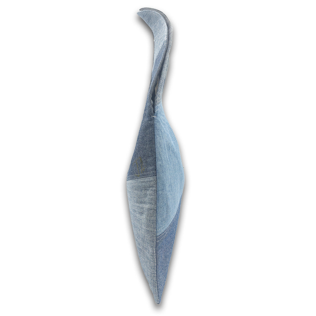 Crafted from a curated mix of re-claimed denim washes, this slouchy bag gives yesterday’s textiles a bold new life. Its soft-structured silhouette is pieced together with intentional paneling, visible top stitching, and raw-edge distressing that celebrates the beauty of imperfection and the story behind every scrap. Distressed appliqués add texture and dimension across the front, while subtle hand-written fabric codes nod to the garment’s past life. Finished with a fully lined interior, two functional pockets, and a secure magnetic snap closure, this spacious tote is designed for effortless everyday carry.